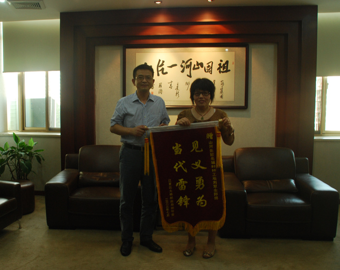 圖為集團(tuán)公司副總經(jīng)理兼湖北公司總經(jīng)理林中茂(左)接受郭琴香(右)贈送的錦旗