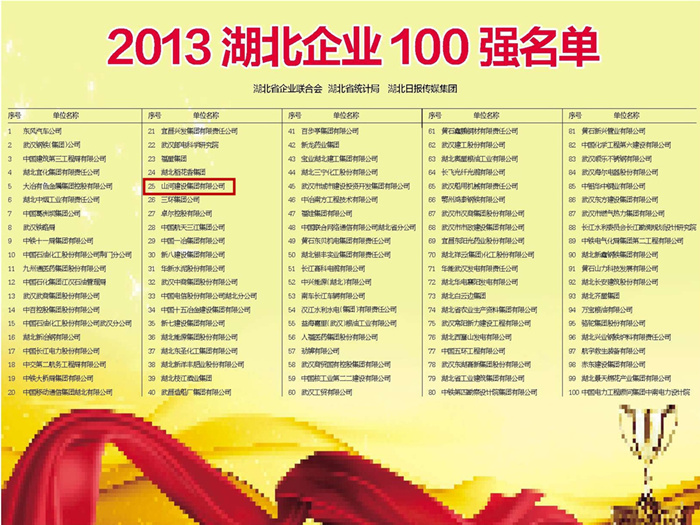 10月22日,2013湖北企業(yè)百強發(fā)布會、第十八屆湖北省優(yōu)秀企業(yè)、優(yōu)秀企業(yè)家表彰大會暨八屆二次會員代表大會隆重舉行。湖北省企業(yè)聯(lián)合會、湖北省統(tǒng)計局和湖北日報傳媒集團聯(lián)合發(fā)布了2013湖北企業(yè)100強名單,山河集團位列湖北百強企業(yè)第25位并榮獲“第十八屆湖北省優(yōu)秀企業(yè)(金鶴獎)”。山河集團董事長程理財同時被湖北省企業(yè)聯(lián)合會和湖北省企業(yè)家協(xié)會聯(lián)合授予“第十八屆湖北省優(yōu)秀企業(yè)家(金牛獎)”榮譽稱號。