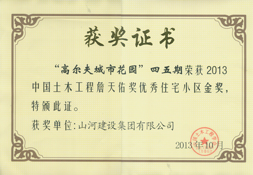 近日,由中國(guó)土木工程學(xué)會(huì)住宅工程指導(dǎo)工作委員會(huì)組織的2013年度“中國(guó)土木工程詹天佑優(yōu)秀住宅小區(qū)”頒獎(jiǎng)儀式在北京舉行,由山河集團(tuán)承建的 “武漢高爾夫城市花園四、五期”榮獲“中國(guó)土木工程詹天佑獎(jiǎng)優(yōu)秀住宅小區(qū)金獎(jiǎng)”。
