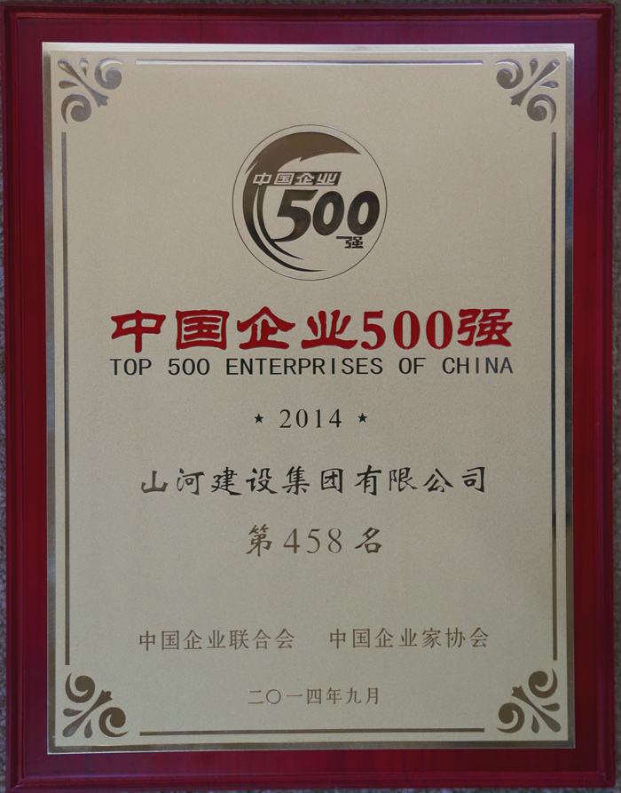 9月2日,“2014中國(guó)500強(qiáng)企業(yè)高峰論壇”在重慶舉行,會(huì)議當(dāng)天發(fā)布了2014中國(guó)500強(qiáng)企業(yè)榜單。山河集團(tuán)營(yíng)業(yè)收入256億元,排名458位,首次進(jìn)入中國(guó)企業(yè)500強(qiáng)。