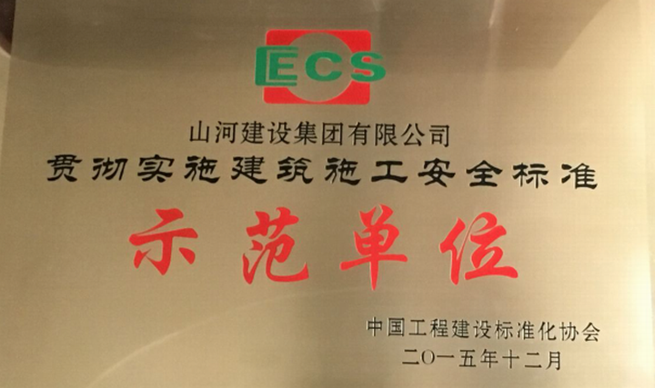 2015年12月,中國(guó)工程建設(shè)標(biāo)準(zhǔn)化協(xié)會(huì)施工安全專業(yè)委員會(huì)召開了貫徹實(shí)施建筑施工安全標(biāo)準(zhǔn)示范單位表彰大會(huì),山河集團(tuán)榮獲“2015年度全國(guó)貫徹實(shí)施建筑施工安全標(biāo)準(zhǔn)示范單位”榮譽(yù)稱號(hào)。