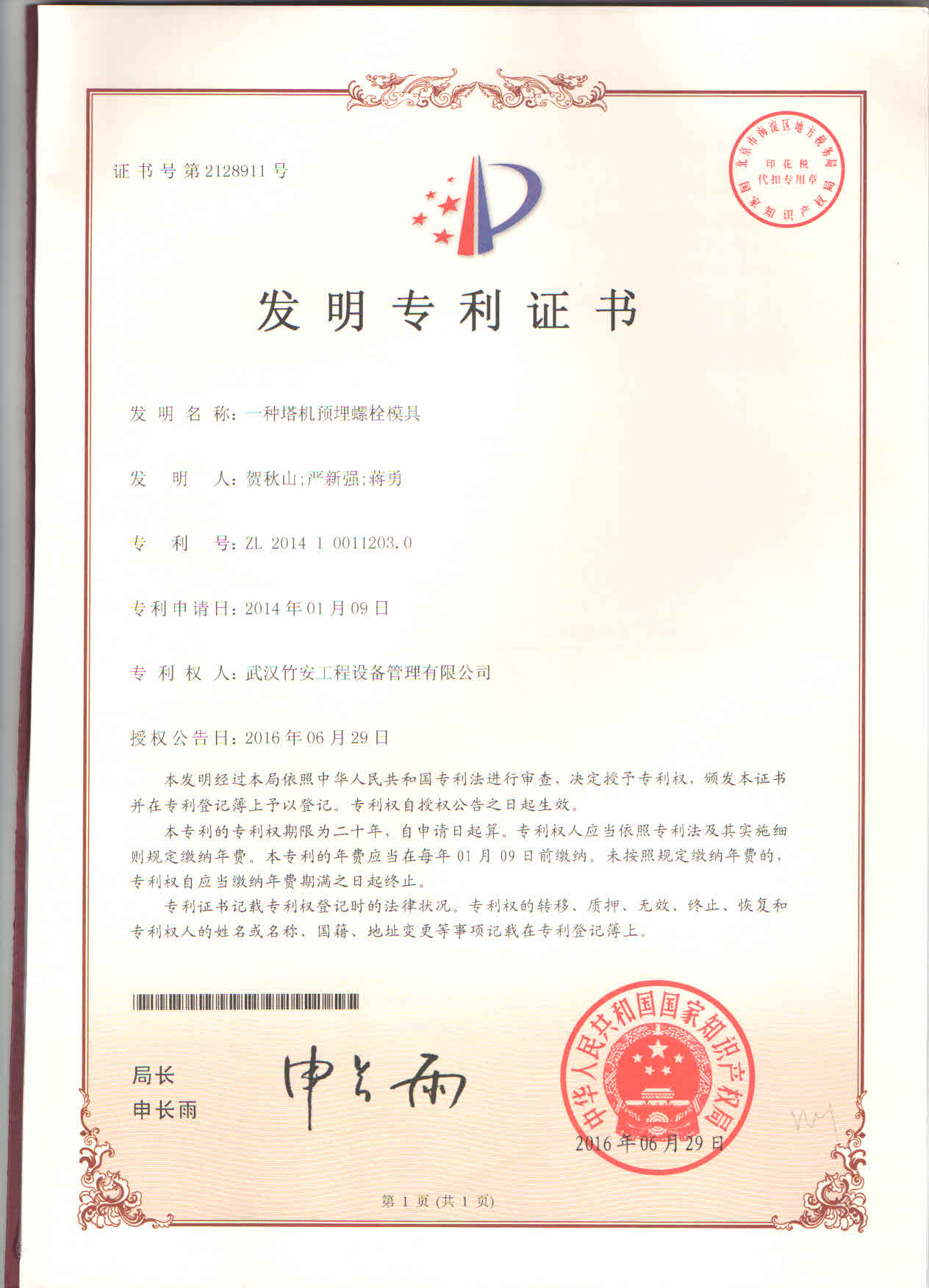 近日,武漢竹安設(shè)備管理有限公司首次研發(fā)的一項(xiàng)發(fā)明專利“一種塔機(jī)預(yù)埋螺栓模具”獲國家知識(shí)產(chǎn)權(quán)局授權(quán),專利號(hào):ZL200410011203.0。