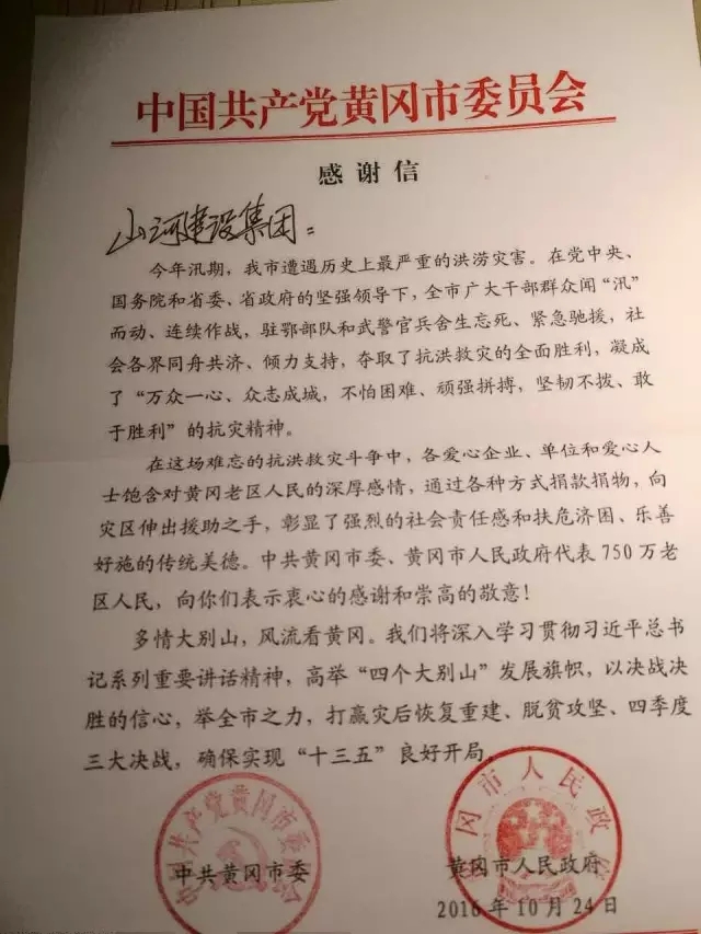 山河集團(tuán)在這場難忘的抗洪救災(zāi)斗爭中,通過各種方式捐款捐物,伸出援助之手,其中飽含了對黃岡老區(qū)人民的深厚感情,更彰顯了強(qiáng)烈的社會(huì)責(zé)任感與作為“中國500強(qiáng)”的企業(yè)擔(dān)當(dāng)。